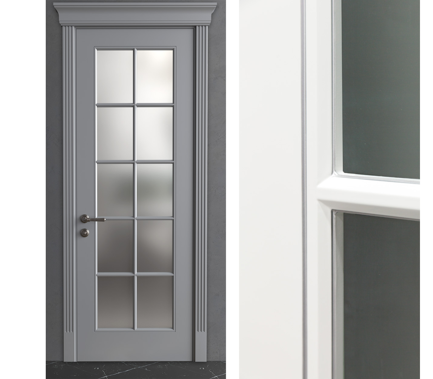 Эмалированное покрытие наносится по итальянской технологии в несколько слоёв с промежуточным шлифованием каждого слоя, что гарантирует идеально гладкую поверхность, устойчивую к влаге и механическим воздействиям. Благодаря широкой палитре RAL вы можете заказать дверь в классическом белом (RAL 9003 или 9010), элегантном сером (RAL 7035), драматичном чёрном или любом другом оттенке, который гармонично впишется в вашу цветовую концепцию. Эмалированная кромка полотна и возможность установки скрытых петель создают безупречный визуальный эффект и подчёркивают премиальность исполнения.