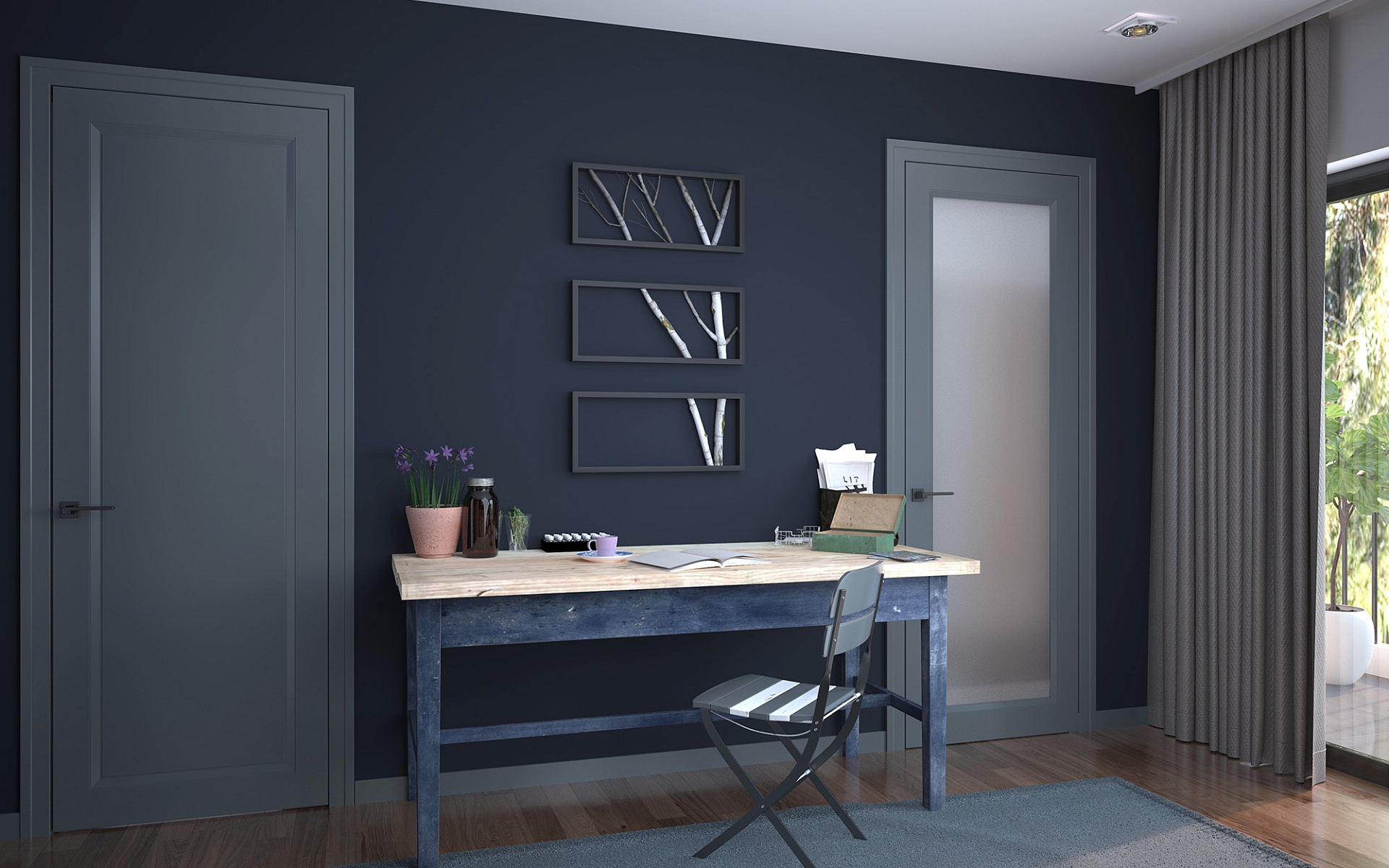 - Глухое полотно без остекления: Полная приватность и усиленная звукоизоляция. Оптимальное решение для спален, кабинетов, гардеробных, детских комнат — там, где важна изоляция от шума и посторонних взглядов.