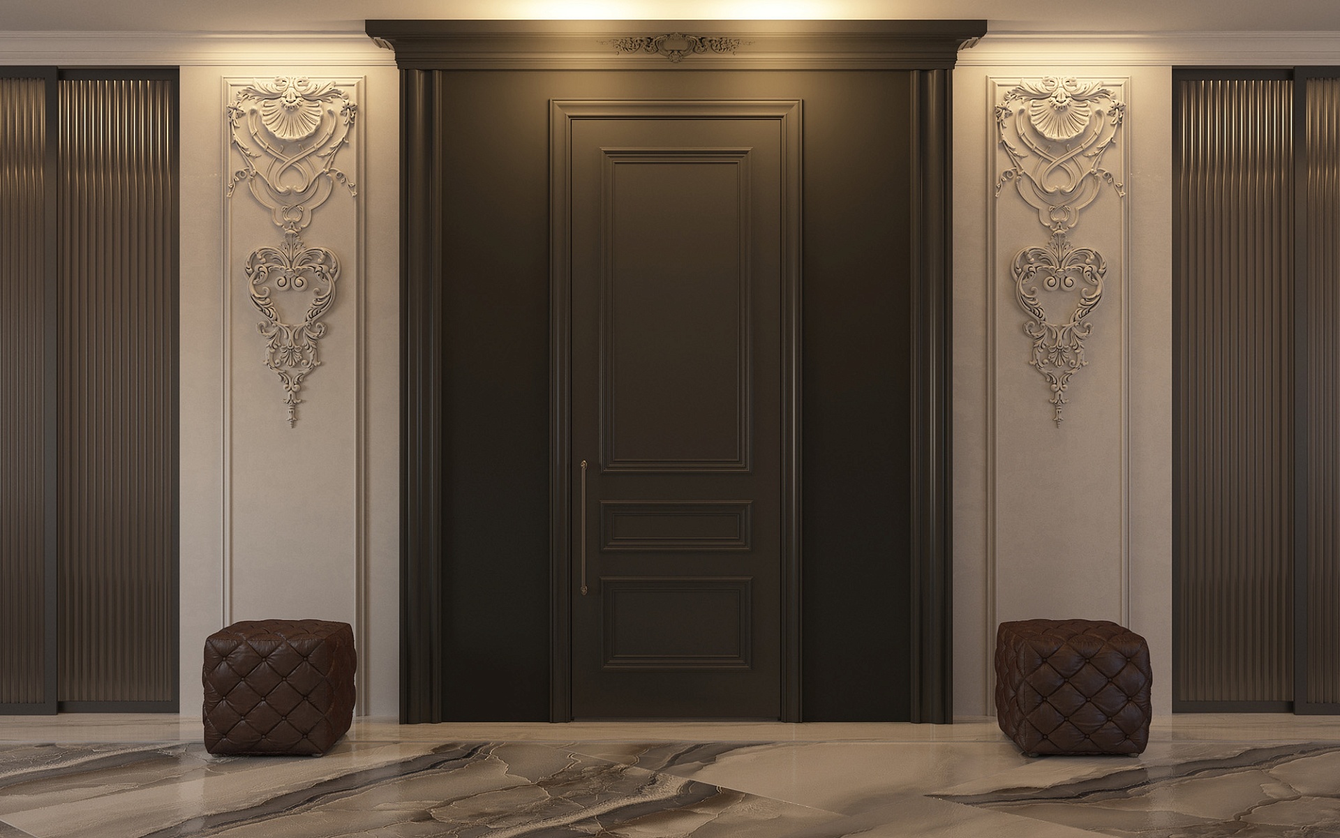 - Скульптурная 3D-фрезеровка: Глубокая сложная многоуровневая обработка полотна создаёт максимальный объёмный рельеф, который становится самостоятельным декоративным элементом и демонстрирует высокий уровень производственной культуры.