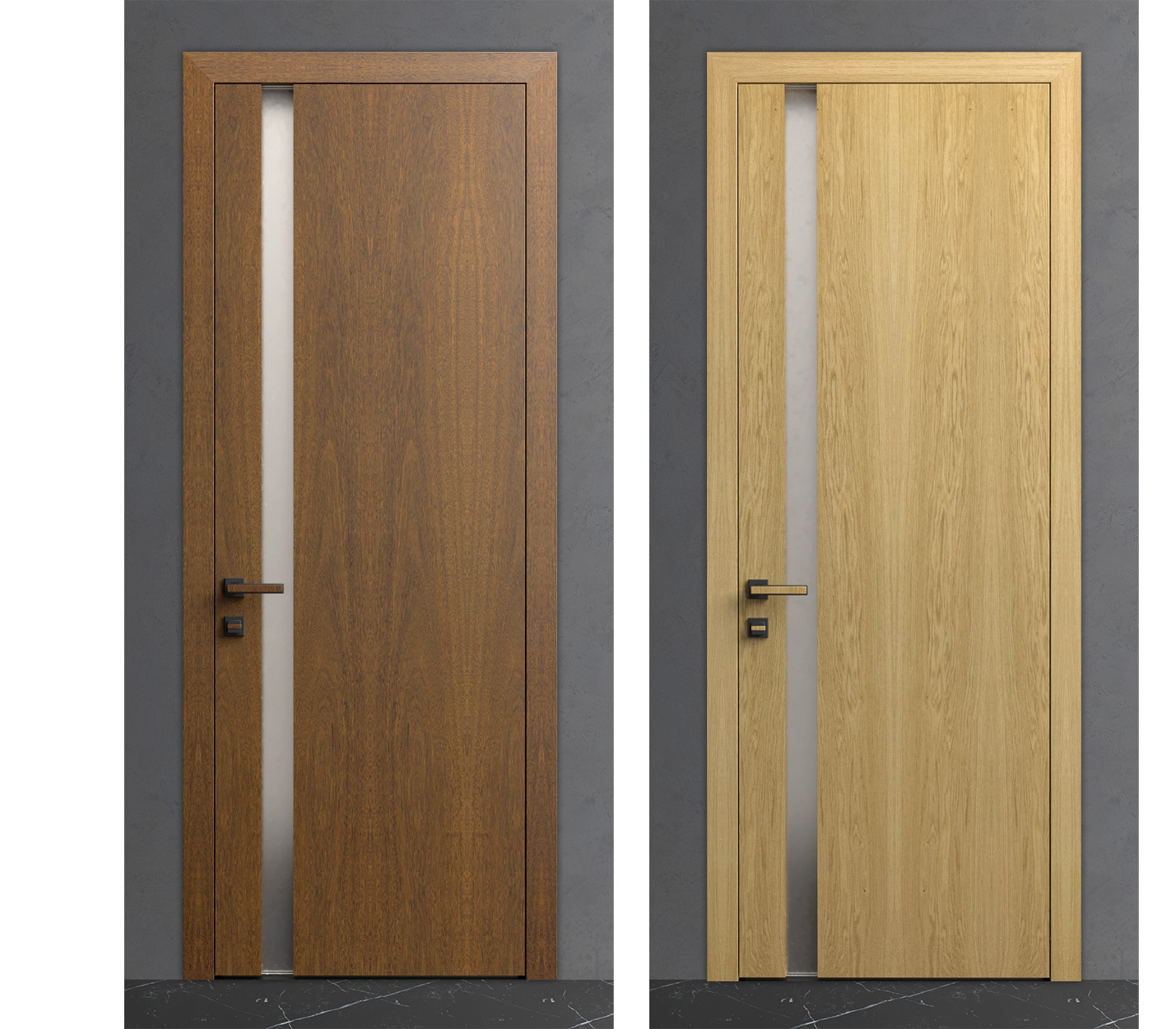 Разнонаправленная укладка шпона — это не просто дизайнерский приём, а способ создать визуальную динамику на абсолютно гладкой поверхности. В зависимости от освещения и угла обзора, текстура раскрывается по-новому: вертикальные волокна визуально вытягивают пространство, горизонтальные добавляют объёма, а их пересечение создаёт ритм и глубину. При этом отсутствие рельефных элементов делает уход за дверью максимально простым — достаточно регулярной влажной уборки мягкой тканью.