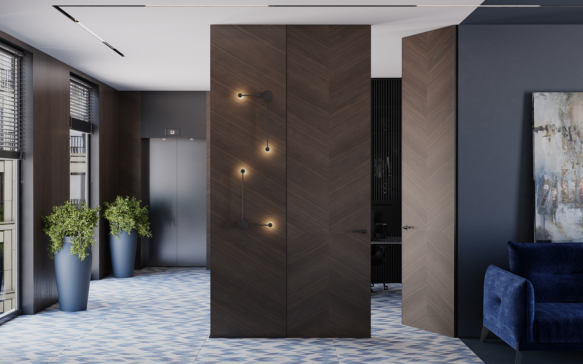Геометрия природы в каждой линии — разнонаправленная укладка шпона превращает дверь в архитектурный акцент.